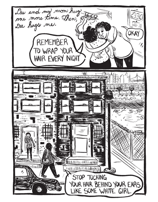 Another interesting artistic choice was to leave everything in black and white. In some of the stories, there is no differentiation in skin colour between white and black characters, but the black characters have detailed curly, dark hair and larger lips. This choice emphasizes the role hair plays in the graphic novel and the characters’ lives.